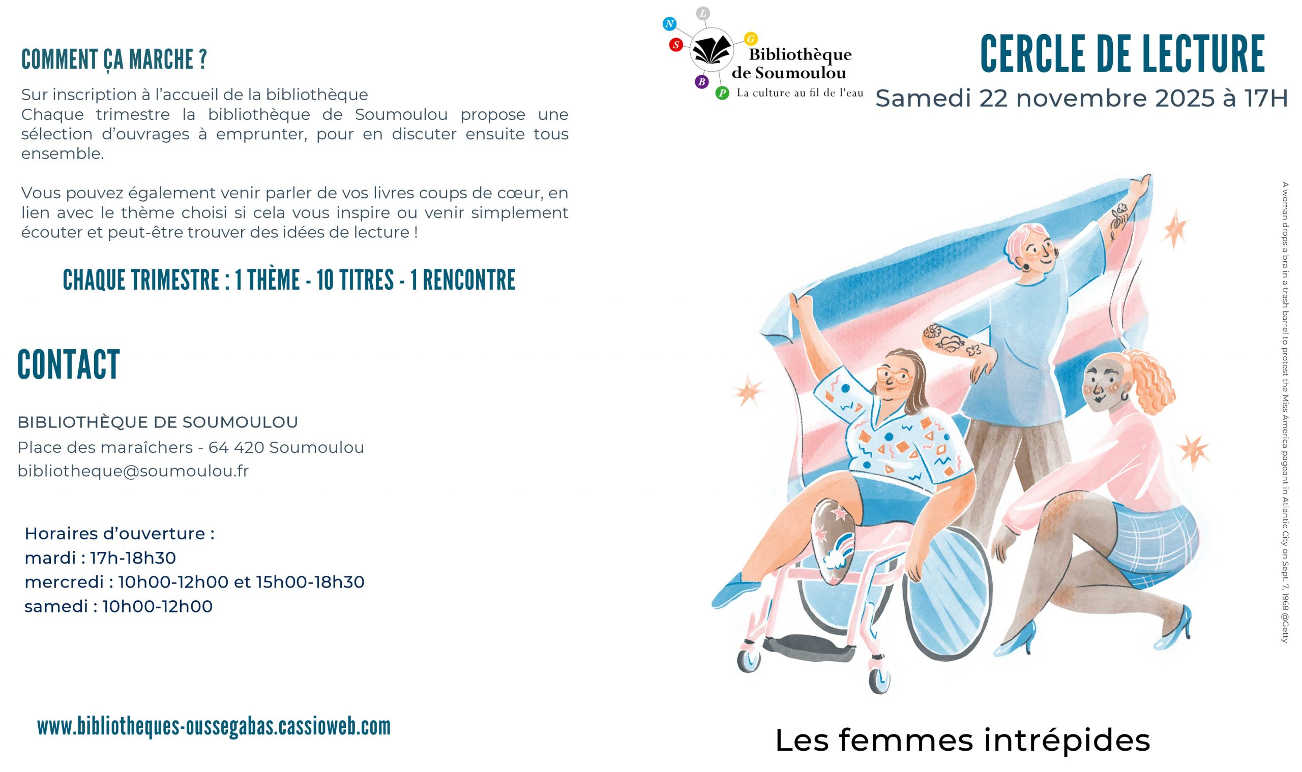Soumoulou : Cercle de lecture, samedi 22 novembre 2025 à 17h00, sur le thème Les femmes intrépides. Inscription à l’accueil de la bibliothèque.
